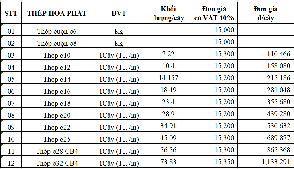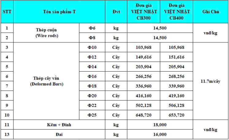 Thứ tự | Tên sản phẩm | Độ dài (m) | Trọng lượng (kg) | Giá chưa VAT (vnđ/kg) | Tổng giá chưa VAT (vnđ/kg) | Giá có VAT (vnđ/kg) | Tổng giá có VAT (vnđ/kg) | |