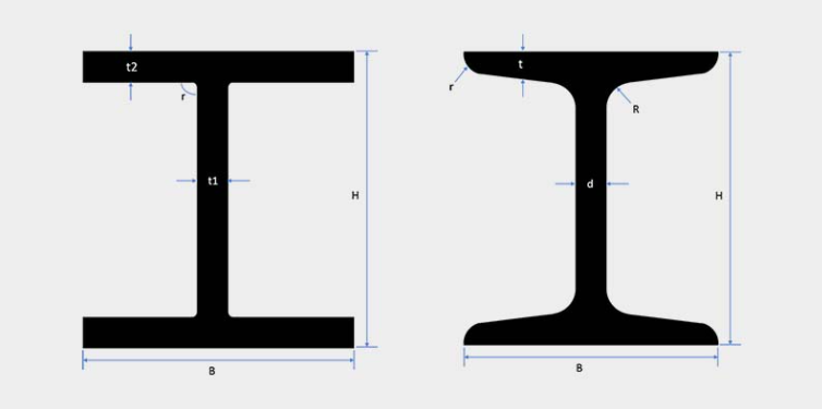 | Thép hình I-Dầm chữ I là dầm thép được chế tạo bằng cách phay hoặc cán thép theo hình chữ I. | Thép hình H-Dầm chữ H là dầm thép được làm bằng thép cuộn có hình dạng của bảng chữ cái “H.” Chúng được chế tạo dưới dạng các đơn vị tích hợp sẵn. Các mặt bích được hàn với web để tạo thành mặt cắt H. Dầm chữ H còn được gọi là dầm mặt bích rộng. |